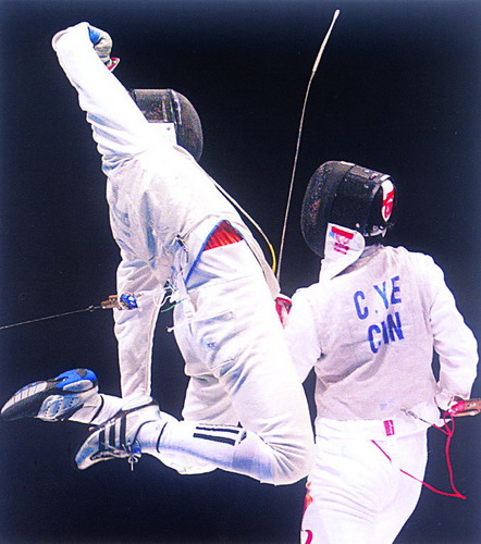二○○四年第二十八届雅典奥运会。在男子花剑比赛中,意大利选手瓦尼对阵中国选手叶冲。