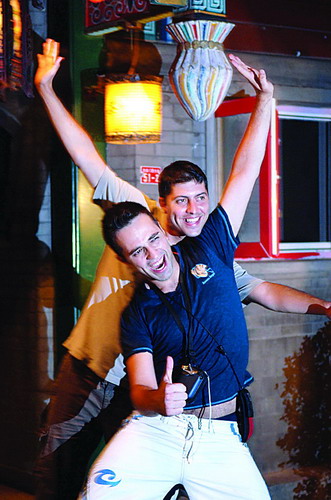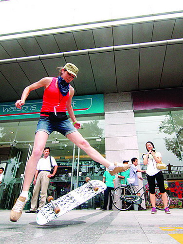 玩外国游客在北京宣武门附近一家商场门前玩滑板。随着奥运会的开幕,世界各地游客来到北京观看比赛,同时也享受他们的休闲快乐之旅。新华社发(郭国权摄)