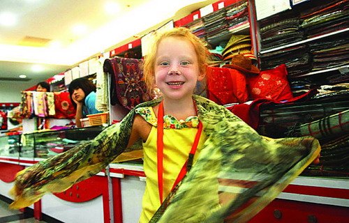 乐一名美国小游客在北京红桥市场一个摊位前,身披丝巾兴奋地跳舞。奥运会期间,许多国外游客及运动员、教练员利用闲暇时间,走进北京特色商街。新华社发