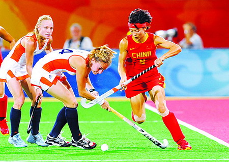 曲棍球――女子:中国队获得亚军8月22日,中国队球员付宝荣(右)在比赛中突破。当日,在北京奥运会曲棍球女子决赛中,中国队获得亚军。新华社记者李勇摄 |