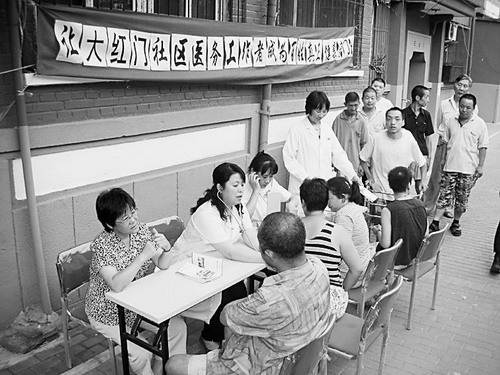 近年来,北京市丰台区大红门医院强化医疗事业是社会永远的公益事业的服务意识,把百姓需求和利益放在首位。图为北京市政协委员黄慧南(左一)在和医务人员一起给东街社区残疾人义诊。