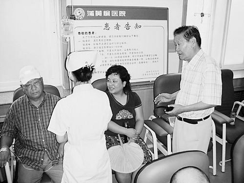 北京市丰台区蒲黄榆医院医护人员树立“讲文明、树新风”的服务意识,不断改进工作作风,使百姓看病越来越方便。图为北京市卫生局社会监督员文复兴(右一)在输液室向患者征求对医务人员服务满意程度的情况。紫英摄
