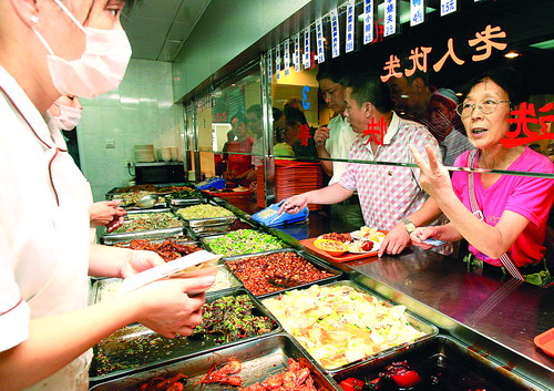 9月10日中午,社区居民在“社区食堂”内购买午餐。上海外国语大学与学校所在地的上海市虹口区两个街道合作,在居民小区内开设了四家面向社区居民的餐饮服务社,对于行动不便的老人还送菜到家。餐饮服务