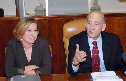 图为以色列总理奥尔默特(右)和执政的前进党新主席利夫尼在耶路撒冷参加内阁会议。