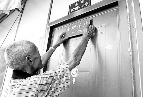 都江堰“勤俭人家”安置点居民邓占儒将“文明住户”授牌贴在门上。日前,四川都江堰市命名“勤俭人家”和“幸福家园”为首批文明安置点,349名住户为首批文明住户。“勤俭人家”是四川地震灾区最大的安置点之一。新