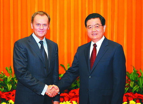 10月23日,国家主席胡锦涛在北京人民大会堂会见来华进行正式访问并出席第七届亚欧首脑会议的波兰总理图斯克。新华社记者鞠鹏摄