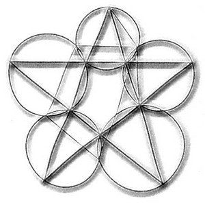 1999年,江泽民同志在澳门濠江中学提出了一个几何命题:五角星的五角套上五个环后,环环相交的五个点必定共圆。 |