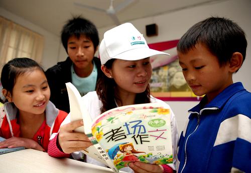 今年11月11日,一名志愿者(中)在四川广安市高原小学的“留守学生之家”辅导孩子们学习。据悉,该市由社会各界出资捐建的“留守学生之家”、“留守学生托管中心”等组织已达1200多个。新华社发(邱海鹰摄)