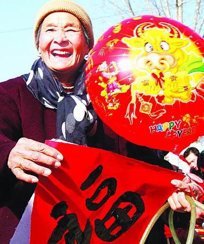 1月10日,一位农村老大娘高兴地展示书法家赠送给她的“福”字门贴。当日,山东省枣庄市市中区的12名书法家带着红纸、笔墨等来到当地的集贸市场,现场为农民朋友免费写春联、门贴。