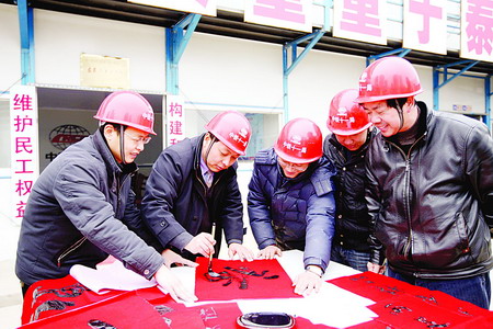 春节之际,在国家重点工程――武汉地铁二号线螃蟹甲站工地,中国铁建十一局集团城轨公司向坚守在工地过年的农民工送上“福”字及春联,送上牛年的祝福。