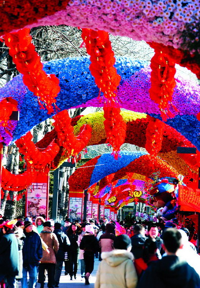 春节期间,北京庙会在传统内容的基础上,更增添了北京奥运会、残奥会成功举办、“神舟七号”上天和非物质文化遗产等特色,吸引了许多国内外游客。这是龙潭庙会上络绎不绝的游人。