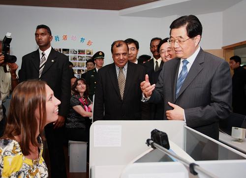 参观过程中,胡锦涛向三位不远万里来到这里执教的中国老师张鑫、魏爱玲、郭卫红表示感谢。