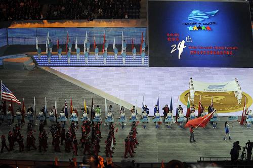 20时整,开幕式开始。在运动员入场式中,来自44个国家和地区代表团的成员欢快地步入会场,受到全场观众热烈欢迎。当以全国花样滑冰锦标赛冠军刘艳为旗手的中国代表团最后一个进入会场时,观众激动地挥舞手中的五星红旗,欢呼声经久不息。中国代表团共有193名运动员,将参加12个大项69个小项的角逐。这是中国自参加世界大学生冬运会以来参赛规模最大、参赛项目最全、参赛人数最多的一届,中国代表团也是本届大冬会参赛人数最多的代表团。