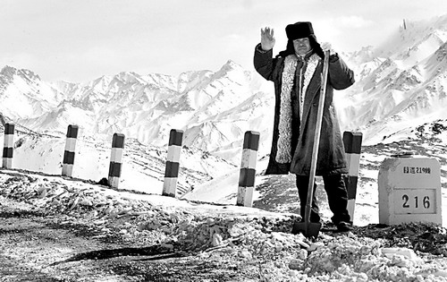 2月12日,在新藏公路上清扫积雪的护路工人向过往车辆招手致意。