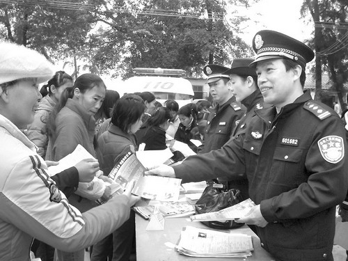 3月25日,广西北海市公安局银海分局民警举行送证送法上门服务农民工活动。从3月初开始,该局公安民警深入农民工当中,为他们排忧解难,保护他们的合法权益。