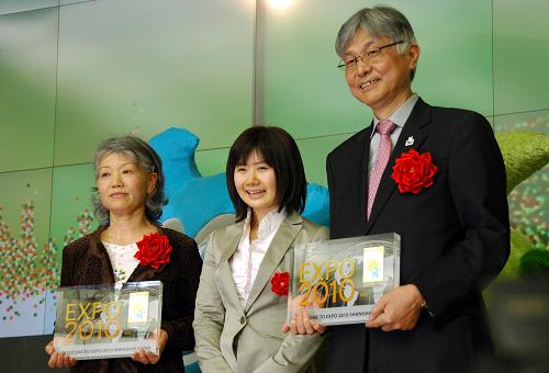 图为4月11日,在日本东京举行的上海世博会推介周开幕式上,上海世博会日本推广形象大使福原爱(中)与获赠门票的日本民间“世博迷”山田外美代(左)和日本观光厅长官本保芳明合影。在当天举行的上海世博会推介周开幕式上,上海市常务副市长杨雄与上海世博会日本推广形象大使福原爱一起向日本观光厅长官本保芳明和日本市民代表赠送了上海世博会门票。新华社发