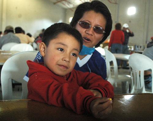 5月2日,墨西哥东部韦拉克鲁斯州男孩埃尔南德斯和母亲在政府临时搭建的免费食堂休息。墨西哥韦拉克鲁斯州的4岁男孩埃尔南德斯是墨西哥第一位被确诊感染甲型H1N1流感的患者。埃尔南德斯经过半个多月的治疗已经痊愈,恢复正