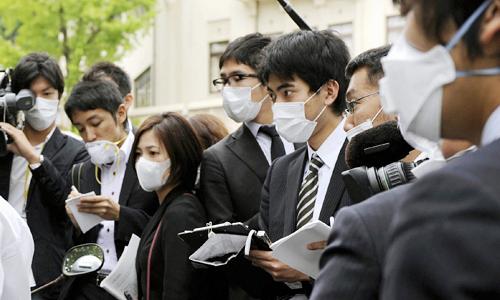 5月16日,在日本神户,记者们戴着口罩在确诊感染甲型H1N1流感患者所在的高中采访。当日,日本厚生劳动省宣布神户市一名17岁的高中男生确诊感染甲型H1N1流感,这是日本国内首例非输入型甲型H1N1流感病例,也是第5例确诊病例。新华社/共同社