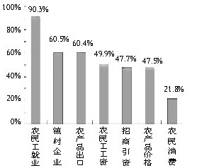 调查显示,高达96.8%的村干部对目前农村改革发展的现状表示满意和基本满意。对去年以来持续蔓延的世界金融危机,有97.9%村干部回答知道或知道一点。有32%的村干部表示非常关心,64.7%的人比较关心金融危机发生和发展过程和趋势。96.9%的村干部表示已感受到金融危机对农村发展的影响和冲击。在我们列出的金融危机对农村发展影响和冲击的7种表现中,排前3位的分别是:增加了农民工就业困难,影响了农产品出口贸易,影响了镇村企业发展(见图1)。对农村发展的这种冲击和影响,村干部认为迫切需要增加危机意识的占49.3%,要有一点危机意识的占44.1%。上述调查结果,一方面说明这场源于美国次贷危机的金融危机影响之深之广,即使是我国最基层的村干部们,也已明显地感受到了压力。另一方面也说明,广大村干部都高度关注国际金融危机给农村发展带来的挑战,对应对挑战有清醒的头脑和较充分的思想准备。