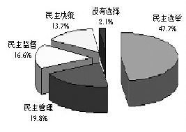 村民自治是农村民主政治建设主要的也是基础性内容。对村民自治总体评价,13.3%的村干部认为“非常成功,效果明显”,72%的村干部认为“比较成功,效果逐步显现”,只有13.8%的村干部认为“说不清楚,效果不够明显”。可见,我国农村村民自治,已取得了明显的进展。然而,在关于目前村民自治运作情况调查中,52.7%的村干部觉得运作情况一般,还有7.6%的村干部认为运作很差,只有39%的村干部选择“正常”。在四个民主中村干部认为做得最好的是民主选举占47.7%(见图4)。