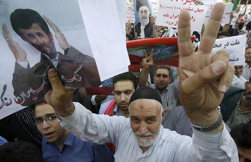 6月16日,在伊朗首都德黑兰,人们举着总统艾哈迈迪-内贾德(前)和最高领袖哈梅内伊(后)的照片参加集会。当天,成千上万的伊朗民众在德黑兰举行大规模的“团结集会”,以表达希望国家稳定和团结的诉求。