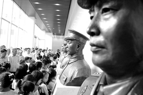 七月一日,参观者在瞻仰铜像。当日,首批四十二尊井冈山革命斗争时期领导人及革命先烈半身铜像落成揭幕仪式在井冈山革命博物馆举行。据悉,八一南昌起义、井冈山革命斗争时期领导人及革命先烈半身铜像共一百尊,其中