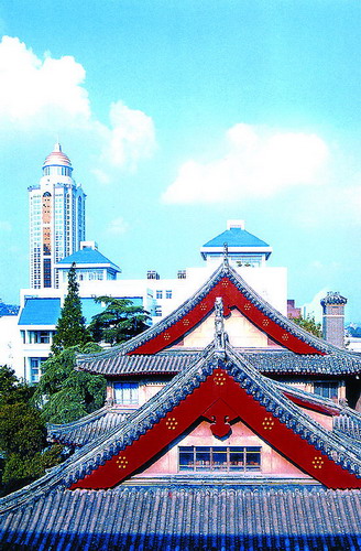 1952年秋,南京大学文、理、法学院与金陵大学合并,迁入金陵大学原址。不过,当时亲历其事的我辈,则是很有想法的。当年的校门在今教学楼东头,是一座小平房,进门左手即大礼堂(原是礼拜堂)。老图书馆和旁边的小教堂,都是校门外的建筑了。主要校区只有北大楼、东西两大楼、大礼堂。干支楼是派作学生宿舍的。活动空间是太小了。对比四牌楼高大的校门,笔直的林阴道,巍峨的大礼堂,反差实在很大。于是学生的牢骚话出来了:“倒霉!让我们进庙门。”话虽如此,那泛着绿色光影的圆形礼堂,那潜虬幽姿的六朝松,还有师范学院大楼里那幅徐悲鸿的巨画,却永远镌刻在我的梦中了。(郭维森)