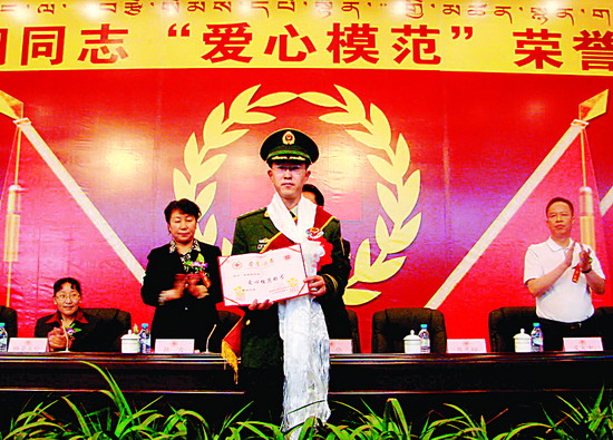 在西藏工作的武警水电三总队十支队工程师熊忠翔因成功捐献了造血干细胞,挽救了一名白血病患者的生命,日前被西藏自治区人民政府授予“爱心模范”荣誉称号,自治区副主席德吉称他为“我区造血干细胞捐献的第一人”。