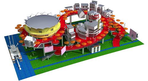 一条长约400米的8字形街道,26个造型独特的房子――它们都是一个个独立的小型展馆――沿街分布。“快乐之街”象征了一座理想中的城市,建筑以井然有序的方式位列街道两旁。城市生活的各个方面都相互融合,全然不同于按住宅、工作和工业区域进行职能划分的现代城市规划。沿着快乐街,参观者能欣赏街道两旁别致的楼宇,从而感受浓郁的荷兰风情,体验城市发展的理念,感受荷兰在空间、能源以及水资源利用上的创新成就。荷兰馆围绕“城市,让生活更美好”的主题,展现人类与生活环境相融相洽的创新技术,表现荷兰人民如何巧妙地利用自然资源,使城市生活更加健康环保。