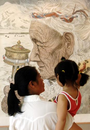 8月1日,一对母女在参观展出的中国画作品。当日,第三届安徽美术大展中国画作品展在安徽合肥开幕,400幅优秀作品参展。据悉,展览中的优秀作品,将选送第十一届全国美术作品展。新华社记者李健摄