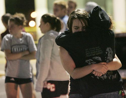 8月4日,人们在美国宾夕法尼亚州匹兹堡郊区发生枪击事件的一所健身房外互相安慰。据美国有线电视新闻网报道,一名男子当晚走进匹兹堡郊区一所健身房开枪行凶,造成包括这名男子在内的至少5人死亡,另有15人受伤。