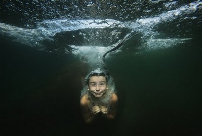 在俄罗斯圣彼得堡以西一百公里的湖中,一个小姑娘游泳时跳入水中。