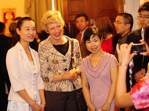 9月10日,在英国伦敦的中国大使馆,来自中国的汉语助教与英国儿童、中小学与家庭部官员温・哈里斯(左二)合影。当日是中国的教师节,中国驻英使馆为日前抵英的汉语助教举行欢迎招待会。此次来英的“汉语助教”项目老师共