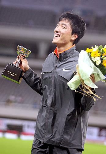 九月二十日,中国选手刘翔在颁奖仪式上。当日,在二○○九上海国际田径黄金大奖赛男子一百一十米栏比赛中,刘翔跑出和冠军特拉梅尔同样的十三秒一五,获得亚军。这是刘翔在北京奥运会退赛后首次参加比赛。