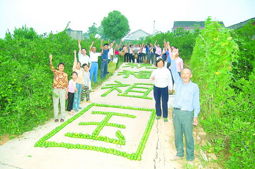 国庆到来之际,柑橘之乡湖南石门县的橘农喜上眉梢,今年柑橘又获丰收,9月26日,该县龙凤园艺场的橘农自发组织起来,在自家橘园旁的大路上,用成熟的柑橘摆成“祝福祖国”四个大字,庆祝新中国六十华诞。