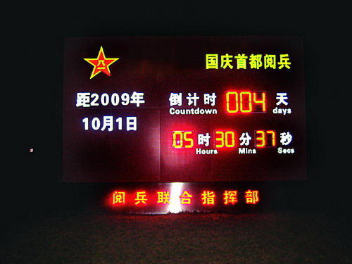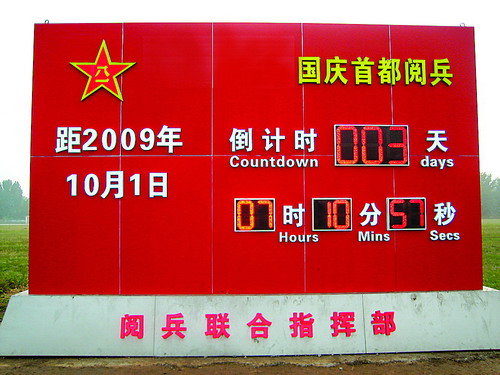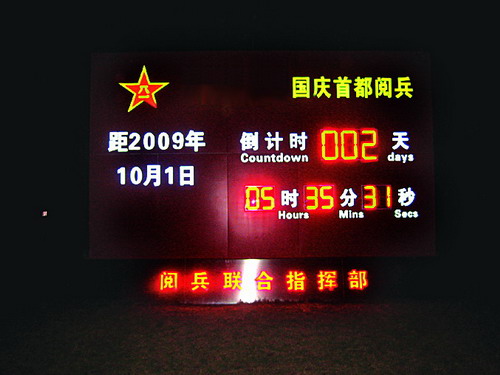 当记者和虞建荣回到驻地时,刚才那片空场上已经聚齐了很多人。旗杆后面有一块大牌子,而这正是阅兵村的倒计时牌。上面赫然写着:距2009年10月1日倒计时2天。电子时钟上的数字正在逐秒递减。