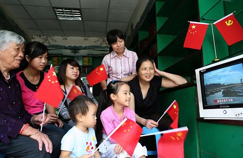 十月一日,四川省华蓥市红星路社区居民在收看国庆阅兵式电视直播。新华社发(邱海鹰摄)