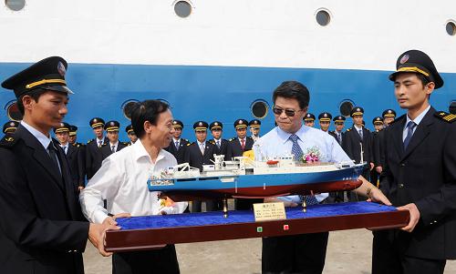 10月18日,武昌船舶重工有限公司的代表范万春(前左二)向广州海洋地质调查局局长马申达(前左三)移交船模。当日,由我国自主设计、建造的第一艘可燃冰综合调查船“海洋六号”在广州正式入列。全船设计排水量达4600吨,续