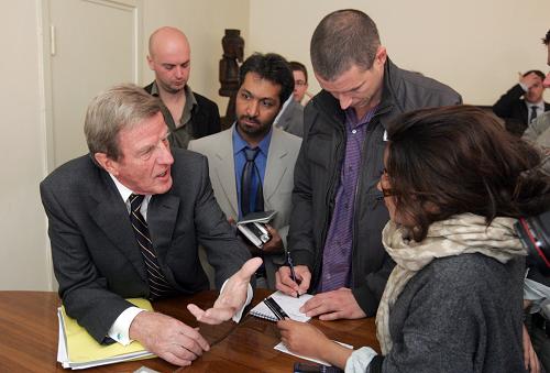 10月18日,在阿富汗首都喀布尔,法国外长库什内(左一)出席记者会后接受采访。正在阿富汗访问的法国外长库什内当日呼吁阿富汗各方,接受联合国选举调查人员和阿独立选举委员会即将公布的阿总统选举最终结果。