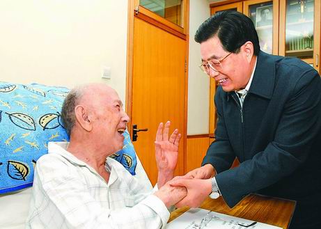 2008年1月19日,胡锦涛同志到钱学森家中看望。新华社发
