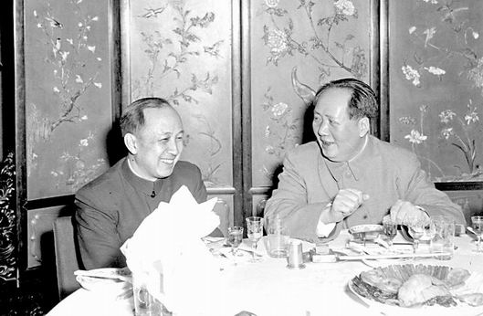 1956年2月,毛泽东同志和钱学森同志在中国人民政治协商会议全国委员会于中南海怀仁堂举行的宴会上交谈。新华社发