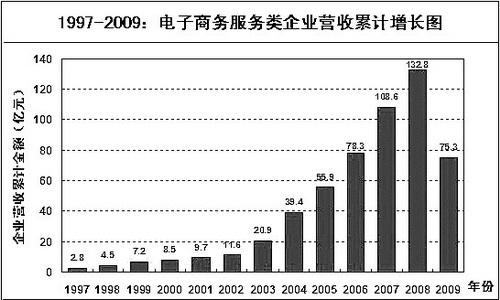 自2006年以来,中国的电子商务市场以每年平均70%的速度递增。根据中国互联网络信息中心12月最新发布的报告,截至今年6月,我国网购用户规模已达8788万,同比增加2459万人。今年上半年,全国网络购物消费总金额为1195.2亿元,全年网购总金额将突破2500亿元。其中,电子商务服务类企业营收累计达75.3亿元,已超过2008年全年的50%(见图表2)。