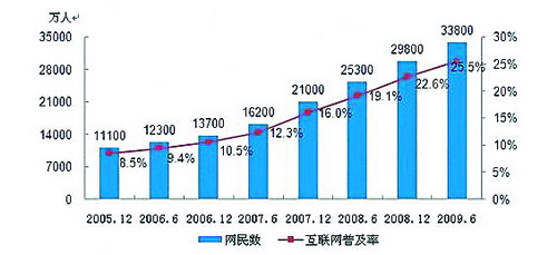 根据中国互联网络信息中心(CNNIC)发布的报告,截至2009年6月30日,我国网民规模已达3.38亿,较2008年底增长13.4%(见图表1)。我国网民规模增长迅猛,继续领跑全球互联网。目前,我国宽带网民规模继续扩大,已有3.2亿网民使用了宽带访问互联网,占比高达94.3%,较2008年底上升了3.7个百分点,我国网民数量、宽带网民数均稳居世界第一,未来数年仍然将保持高速增长的态势。
