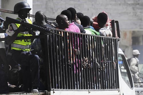 1月29日,在海地首都太子港,参与哄抢电器行的人被押上卡车。当日,太子港发生一起大规模哄抢事件,50多名参与者试图抢劫一家电器行,后被美国士兵和海地警察联合制止。双方发生交火,一名哄抢者在交火中被击毙。新华社记者