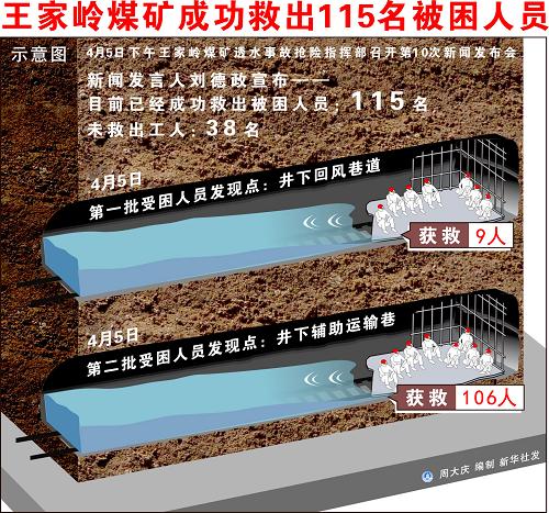 4月5日下午,王家岭煤矿透水事故抢险指挥部开第10次新闻发布会。新闻发言人刘德政宣布,目前已经成功救出115名被困人员。