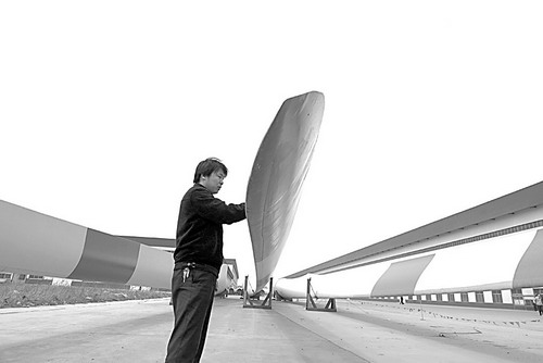 日前,工人在山东邹平县长星风电城整理待外运的风电机组。这批生产中的2兆瓦无刷励磁高速同步大型风力发电机组共700台套,将于今年年底前分批次运往内蒙古通辽风电场。