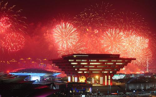 上海世博会开幕式大型灯光喷泉焰火。新华社记者陈凯摄