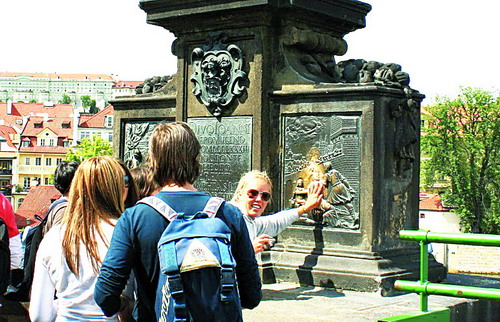 图为游客在布拉格查理大桥排队抚摸内波姆斯基青铜浮雕,以求好运。