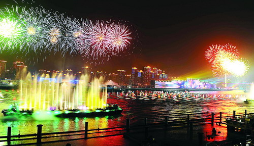 4月30日,中国2010年上海世博会开幕式大型灯光喷泉焰火表演在上海举行。这是绚丽的烟花映照在美丽的黄浦江上。