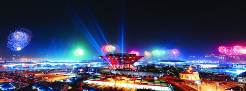 图为中国2010年上海世博会开幕式大型灯光喷泉焰火表演在上海举行。